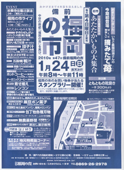 2010年1月24日(日)に備前福岡の市が開催されます。地元生産者手づくりの摘みたていちご、ぜんざい、甘酒、ゆず茶、五穀鴨汁など地元産のあたたかいものや新鮮なものが大集合します。