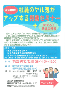 瀬戸内市商工会主催で「社員のヤル気がアップする労務セミナー」を開催しますのでお知らせします。