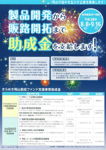 岡山県産業振興財団において、「きらめき岡山創成ファンド支援事業助成金」の募集が開始されておりますのでお知らせします。