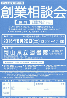 岡山県産業振興財団より「創業相談会」の案内が来ておりますのでお知らせします。