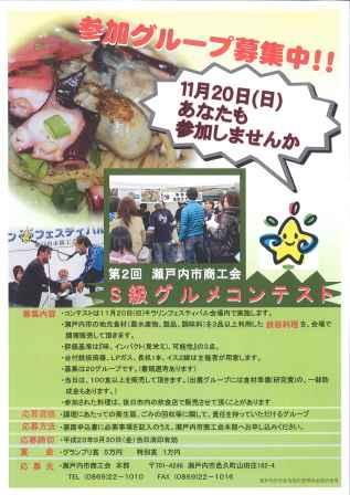 2011/07/25 瀬戸内市S級グルメコンテスト参加グループ募集中! 実施日 平成23年11月20日(日) 場 所 瀬戸内市牛窓町牛窓6399-2(瀬戸内警察署南) コンテスト・瀬戸内市の地元食材3品以上を利用した 鉄板料理を、会場で調理販売して頂きます。 ・審査員及び来場者の合計評価でグランプリを 決めます。 応募資格 調理にあたっての衛生面、ゴミの回収等に関して 責任を持っていただけるグループ。 応募方法 添付の参加申込書に必要事項を記入の上、瀬戸内 市商工会へお申し込み下さい。 応募締切 平成23年9月30日(金)当日消印有効 賞 金 グランプリ 5万円 ◎関連ファイル |