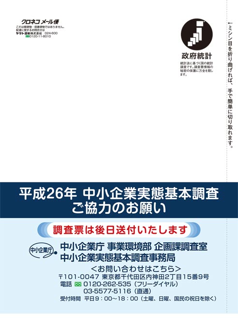 2014/08/04 平成26年中小企業実態基本調査のお願い 中小企業庁から平成26年中小企業実態基本調査の周知依頼が ありましたのでお知らせいたします。 この調査は、創業・新事業に挑戦する中小企業への支援、中 小企業の人材育成・活用、中小企業金融の多様化・円滑化と中 小企業の再生支援、商店街・中心市街地活性化などの施策の企 画・立案及び実施のため、中小企業基本法に基づいて「中小企 業庁」が実施する、中小企業関連統計の基本となる調査です。 8月に、調査対象業種に含まれる全国約360万の中小企業 者から選定された約11万社を対象に当調査が実施されます。 選定された事業者のみな様には、調査へのご協力をいただき ますよう、ようよろしくお願いいたします。 ※添付の画像が印字された封筒が直接事業所あて郵送されてき ます。 ※ご不明な点は、封筒に印字の問合せ先もしくは下記の問合せ 先までお電話ください。 (1)調査内容 企業概要、平成25年度決算状況等 (2)提出期限 平成26年8月29日(金) (3)調査結果 平成27年3月に速報、同6月に確報の公表 (4)問合せ先 平成26年中小企業実態基本調査事務局 TEL:0120−262−535(フリーダイヤル) 03−5577−5116(直通) まで ◎関連リンク ◎関連ファイル |