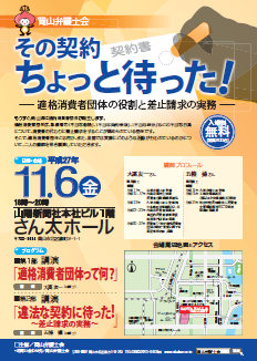 2015/10/16 的確消費者団体についての講演会 もうすぐ、岡山県に適格消費者団体が誕生します。 適格消費者団体は、事業者の「不当な勧誘」、「不当な契約条項」、「不当な表示」などの不当な行為について、消費者の代わりに差止請求をすることが認められている団体です。 そこで、岡山弁護士会において、適格消費者団体についての専門的知見を有する二人の弁護士をお招きし、適格消費者団体の役割と差止請求の実務についてお話しいただく講演会が企画されました。 「その契約ちょっと待った!―適格消費者団体の役割と差止請求の実務―」 日時:平成27年11月6日(金) 18:30〜20:30(18:00開場) 場所:山陽新聞社本社ビル1階 さん太ホール (〒700-8634 岡山市北区柳町2-1-1) プログラム: ◇第1部 講演 「適格消費者団体って何?」 講師 大 友一 氏 (弁護士) ◇第2部 講演 「違法な契約に待った! 〜差止請求の実務〜 」 講師 五條 操 氏 (弁護士) ※入場料無料!(定員200名) 予約不要! 主催:岡山弁護士会 ○お問い合わせ先 岡山弁護士会 住所:〒700-0807 岡山市北区南方1-8-29 電話:(086)223-4401 ◎関連リンク |