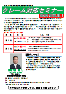 2016/08/05 「クレーム対応セミナー」開催! 平成28年度青年部若手後継者等育成事業 「クレーム対応セミナー」を開催! 【スケジュール】全2回 第1回 9月26日(月)19:00〜21:00 テーマ「クレームとは〜その対応のあり方〜」 第2回 9月29日(木)19:00〜21:00 テーマ「事例で考えるクレーム対応」 【講師】 中小企業診断士 安藤 覺 氏 【受講料】 1,000円(2日間分) 【定員】 20名 【会場】 瀬戸内市商工会 2F会議室 (瀬戸内市邑久町山田庄182−4) ☆お申し込み方法 セミナー受講申込書に必要事項をご記入の上、FAXもしくは 窓口までご持参ください。 ※申込期限:平成28年9月16日(金) チラシは8月メール便に同封、窓口にも置いております。 ☆お問い合わせ先 瀬戸内市商工会 担当:原 瀬戸内市邑久町山田庄182-4 TEL 0869-22-1010 FAX 0869-22-1016  |