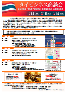 2016/08/09 タイビジネス商談会! 〜タイ企業とのビジネスマッチングを 福岡、岡山、姫路でやりませんか!〜 アセアン経済共同体発足後も生産拠点のハブとして注目されているタイから、自動車部品関連、電気電子部品関連、医療機器関連の製造会社、さらに工業進出に欠かせない工業団地開発会社を合わせて19社が来日します。各社はモノづくりをベースにメタル部品、プラスチック部品、ゴム部品、ワイヤーハーネス等の生産で医療分野にも参入をしています。 輸出入販売、製造委託、合弁会社設立、工場進出用地の確保などタイ企業とのビジネスマッチングにご関心がございましたら、是非タイビジネス商談会へご参加ください。 1.開催日時 平成28年9月15日(木)10時〜13時10分(岡山会場) 2.開催場所 おかやま未来ホール イオンモール岡山5階 (岡山県岡山市北区下石井1-2-1) 3.対象者 輸入販売、製造委託、合弁会社設立、工場進出用地の確保等、 海外進出を検討している中小企業等 4.参加費 無料 5.締切り 平成28年8月29日(月)12:00 6.申込先・問合せ先 タイビジネス商談会 運営事務局(担当:市川・土山・大島) 電 話 03−6416−8670 080−9286−6818 FAX 03−6416−8519 メール ceo-thai@shinnwa.jp ◎関連リンク  |