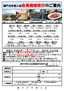 2016/09/05 会員親睦旅行のご案内! 今年もやってきました! 瀬戸内市商工会会員親睦旅行のご案内です! ○実施日 平成28年11月15日(火) ○旅行先 今治方面(詳しくはチラシをご覧ください) ○参加費 お一人様3,000円(お申込み時にお支払いください) ○定 員 40名(定員になり次第、締切り) ※申込20名未満で中止 1会員事業所につき2名様までご参加可能です! ○その他 キャンセルは11月8日(火)まで ※それ以降は参加費の返金不可 ○お申込み・お問い合わせ先 瀬戸内市商工会 瀬戸内市邑久町山田庄182−4 TEL 0869−22−1010 FAX 0869−22−1016 詳しい内容はチラシをご覧ください。 9月9日(金)発送のメール便に同封しております。 また、商工会窓口にも置いておりますのでお立ち寄りください。  |