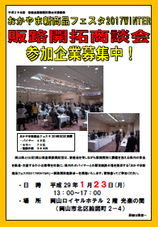 2016/10/27 「販路開拓商談会」が開催されます おかやま新商品フェスタ2017WINTER 販路開拓商談会 参加企業募集中! 岡山県と (公財 )岡山県産業振興財団は、新商品を有しながら 販路開拓に課題を抱える県内の食品を製造・生産する中小企業を 対象に、県内外のバイヤーとの個別商談場を提供する 「おかやま新商品フェスタ2017WINTER」− 販路開拓商 談会−を開催いたします。 皆様奮ってご参加ください。 ○日時 平成29年1月23日(月)13:00〜17:00 ○場所 岡山ロイヤルホテル 2階 光楽の間 (岡山市北区絵図町2−4) ○内容 ・販路開拓商談会 セラーとバイヤーの予約制個別商談会 ・出前個別相談会 ○申込 締切 平成28年11月14日(月) 申込方法 FAX、E-Mailまたは財団ホームページから ○お問い合わせ・お申込み先 公益財団法人岡山県産業振興財団 経営支援部 取引支援課 販路開拓グループ 担当:小野・瀬尾 〒701-1221 岡山市北区芳賀5301 TEL:086-286-9677 FAX:086-286-9691 URL http://www.optic.or.jp E-Mail shinfo@optic.or.jp ◎関連リンク |
