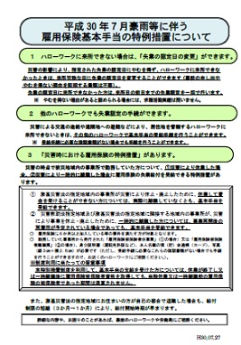 2018/08/07 平成30年7月豪雨災害に係る雇用保険基本手当の特例措置について 平成30年7月豪雨等に伴う 雇用保険基本手当の特例措置について 1ハローワークに来所できない場合は、 「失業の認定日の変更」ができます。 災害の影響により、指定された失業の認定日にやむを得ず ハローワークに来所できなかったときは、来所可能な日に 失業の認定日を変更することができます。 失業の認定日に来所できなかった方は、来所日の前日まで の失業認定を一括で行います。 2他のハローワークでも失業認定の手続きができます。 災害による交通の途絶や遠隔地への避難などにより、 居住地を管轄するハローワークに来所できないときは、 その他ハローワークで基本手当の受給手続きを行うこと ができます。 3「災害時における雇用保険の特例措置」があります。 災害の時点で被災地域内の事業所で勤務していた方に ついて、@災害により休業した場合、A災害により一時的 に離職した場合に雇用保険の失業給付を受給できる特例措置 があります。 @激甚災害法の指定地域内の事業所が災害により休止・廃止 したために、休業して賃金を受けることができない方につ いては、実際に離職していなくとも、基本手当を受給でき ます。 A災害救助法指定地域及び激甚災害法の指定地域に隣接する 地域内の事業所が、災害により事業を休止・廃止したため に、一時的に離職した方については、事業再開後の再雇用 が予定されている場合であっても、基本手当を受給できま す。 ☆詳細やお問い合わせ等は、ハローワークや労働局へ ご連絡ください。 |