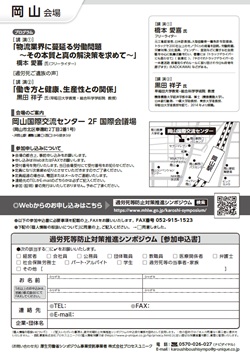 2025/10/02 過労死等防止対策推進シンポジウムが開催されます ◇◆◇ 毎年11月は「過労死等防止啓発月間」です ◇◆◇ 〜 過労死をゼロにし、 健康で充実して働き続けることのできる社会へ 〜 近年、働きすぎやパワーハラスメント等の労働問題によって 多くの方の尊い命が失われ、また心身の健康が損なわれ深刻な 社会問題となっています。 本シンポジウムでは、有識者や過労死で亡くなられた方の ご遺族等にもご登壇をいただき、過労死等の現状や課題、 防止対策について考えます。 [日 時]令和7年11月26日(水)14:30〜17:00 (受付 14:00〜) [場 所]岡山国際交流センター 2階 国際会議場 (岡山市北区奉還町2丁目2番1号) [参加費]無料 お申込みやお問い合わせは、関連リンクから岡山労働局ホーム ページにてご確認ください。 ◎関連リンク ![]() |