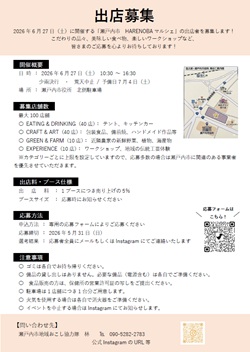 2026/04/28 「瀬⼾内市 HARENOBAマルシェ」出店者募集中! \「 HARENOBA マルシェ」開催決定!/ \瀬戸内・邑久の町に、新しい「ハレの場」が誕生します!/ 岡山(晴れの国)の豊かな恵みと、 邑久の穏やかな時間が 混ざり合う特別な一日。 瀬戸内市の空の下、 最大100のこだわりの店が集まる 「ハレの日」。 おいしい食、美しい手しごと、そして地域の笑顔。 大人も子供も、お気に入りの何かが見つかる場所。 「HARENOBAマルシェ」では出店者様を募集しております! 最大100店舗が集まる圧倒的な賑わいの中で、 あなたの 「ハレ」を表現してみませんか? 開催日時:2026年6⽉27⽇(⼟)10:30 〜 16:30 (少⾬決⾏・荒天中⽌ / 予備⽇7⽉4⽇(⼟)) 開催場所:瀬⼾内市役所 北側駐⾞場 申込⽅法:関連リンクの専⽤応募フォームからご応募ください (Googleアカウントのログインが必要です) 応募締切:2026年5⽉31⽇(⽇) 【問い合わせ先】 瀬⼾内市地域おこし協⼒隊 林( 090-5282-2783) または公式Instagram(@s.s_harenoba2026)まで ◎関連リンク |